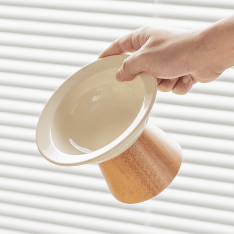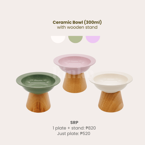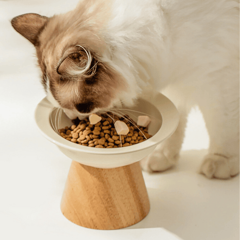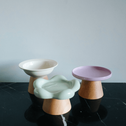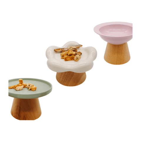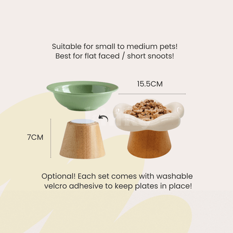 Whisker-friendly low dish plates with elevated stands to make eating easier and more pleasant! Option to get a set with a wooden stand or just the plates.
