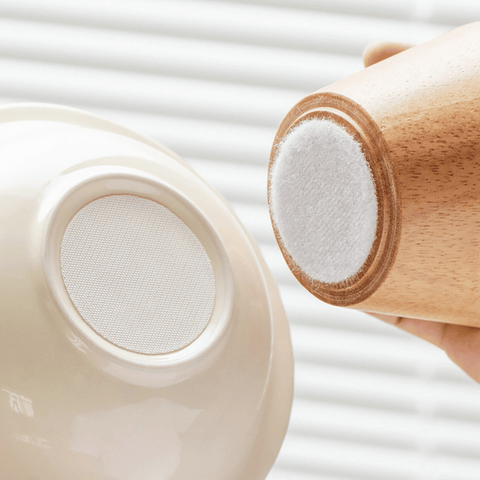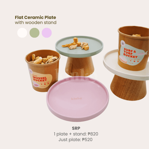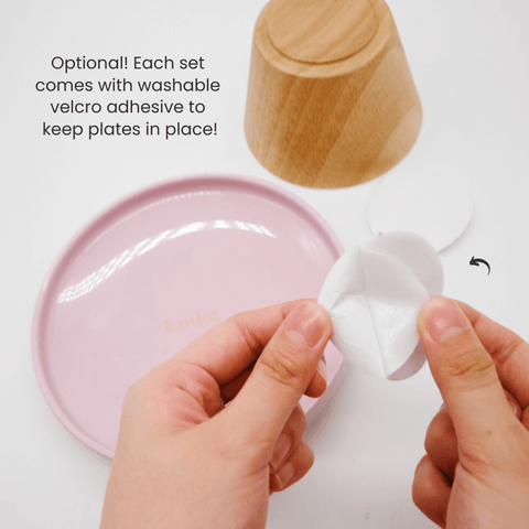 Each ceramic plate + wooden platform comes with a sturdy washable velcro you attach on the stand and plate to keep it in place.