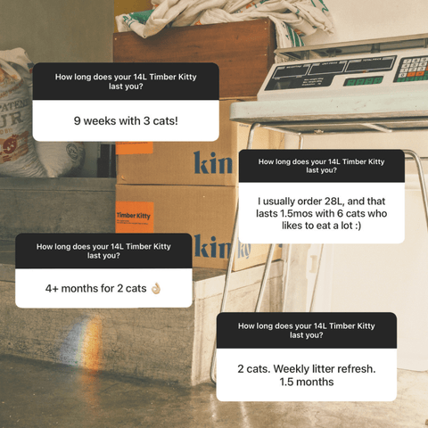 A 4L box is more of a sample size and should last for about 1-1.5 weeks, while a 14L should last for around 1-2 months, some owners are able to extend for much longer reaching 3-4 months. Please do note though, that this will depend on each cat household and litter box size, as each have different habits and requirements.