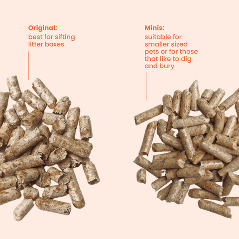 Introducing a thinner pellet size for burrowing preferences! Works best for regular litter boxes (non-sifting) and small pets! You may also mix our original size with the Mini size to get the best of both worlds!